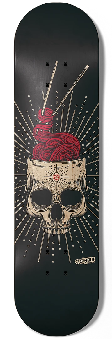The Shibui Yucky Soba is a modern skateboard deck with a fantastic Japanese skull and noodles design. Made from 100% Canadian hard rock maple from managed forests. Generous kicktail with medium concave nose and tail that are great for performing freestyle tricks and cruising.