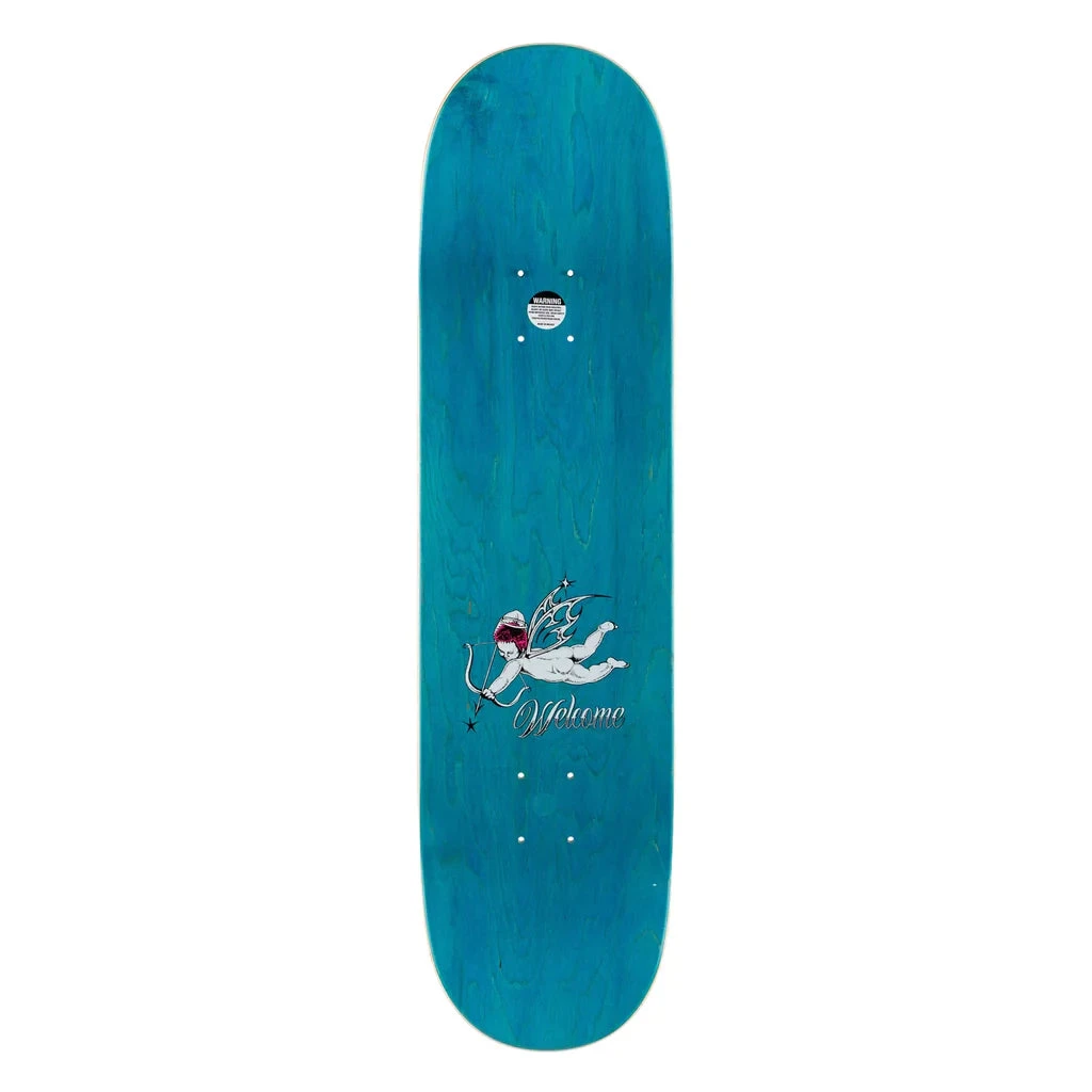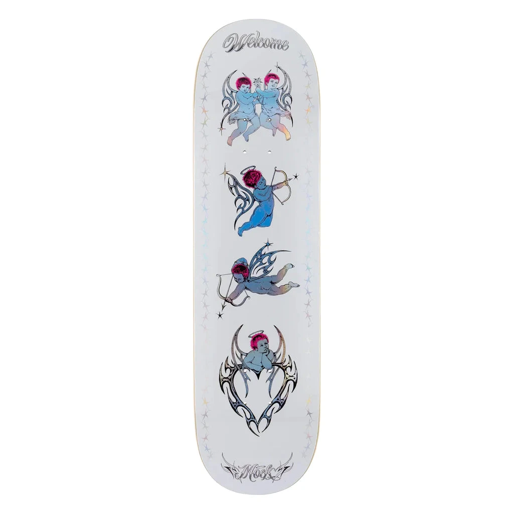 Here is the Welcome Cherubs Evan Mock on Island White and Prism Foil Skateboard Deck in 8.38″ !